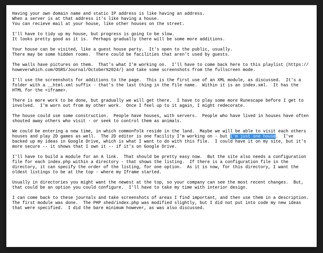 [ Thursday, October 30, 2025 - 10:21 AM ] tek.spinnalley.com will be set up on the server of one of the two. They're like houses that are right next to each other. They have doors - different domain names. There are rooms within the house, which are websites. Some websites have doors to others. [ Thursday, October 30, 2025 - 10:14 AM ] It seems tek.spinnalley.com will be used for my website for my personal profile. There's a problem with the SSL record. It's too long, according to the result. I try to visit it in a web page and get that result, and I know it might be able to be solved but I've already written about using websites with a domain name ending in .com, .org, or .net. I'll try to get tek.spinnalley.com set up on my remote $5 server. tek.spinnalley.com could be on a different server than spinnalley.com. They are two different websites even though they share the same domain name. Once the writing gets done for a month, it could be put into a folder. After a year, all of the months could be put into it. You could access the timeline for a month by traversing the directory. Others could eventually use my idea for a personal, home website and have others type messages for them at it. [ Thursday, October 30, 2025 - 09:48 AM ] This is my journal and I wanted to note about the day. I have some things to do in the future, but today I'm busy with something else. There are a few things I want to do, and this perhaps could be added to my list - this journal. This is in my tek.xdev.zip directory. I wondered if I should have a profile at that address. I could use my small server to do it, but I was hesitant at first. Still, I wonder - are there security gaps? The implementations you might see on websites are done without reverence for the programming code, but the underlying linux software seems to be pretty good. Could one website on a server that's a part of the server you're renting and sharing access your data on it, if you paid the $5/month fee, instead of $30 for a dedicated server? Probably not. It's like a virtual machine, and those other websites don't have access to your portion of the disk. It's all under a system. The remote server is more than just a website. Programs can be run on it. I have my directory listing to work on. There's a new feature that will copy uploaded files into the /tmp/html/${site} directory. I'm working on that still, and it needs some revisions. The bulk was done, and now it also needs some fine-tuning. Another one of my projects is the 3D model idea. I want to make a game. I looked into JavaScript and WebGL. I designed a model last night. Now, this project is my personal profile! I could use it to receive messages, but perhaps others would want to comment on it as well. If there was an implementation to allow a website to deliver a message, it could be done so that it is shown as a comment also. I've got to play some OSRS, and I do that with a stream. I hate to step away from the table, but this is not my sole purpose. I like to have fun, and this is just one fun thing. Although it is exciting to work on the projects. They will come in time. Playing OSRS has also given me some other advantages. I was able to develop my website for it's content, that I recorded. I'm excited for the future that I might have once I get my project done, but I'm enjoying myself at the present time also. If you've been held up by my writing -- maybe it's just something I imagined. | |